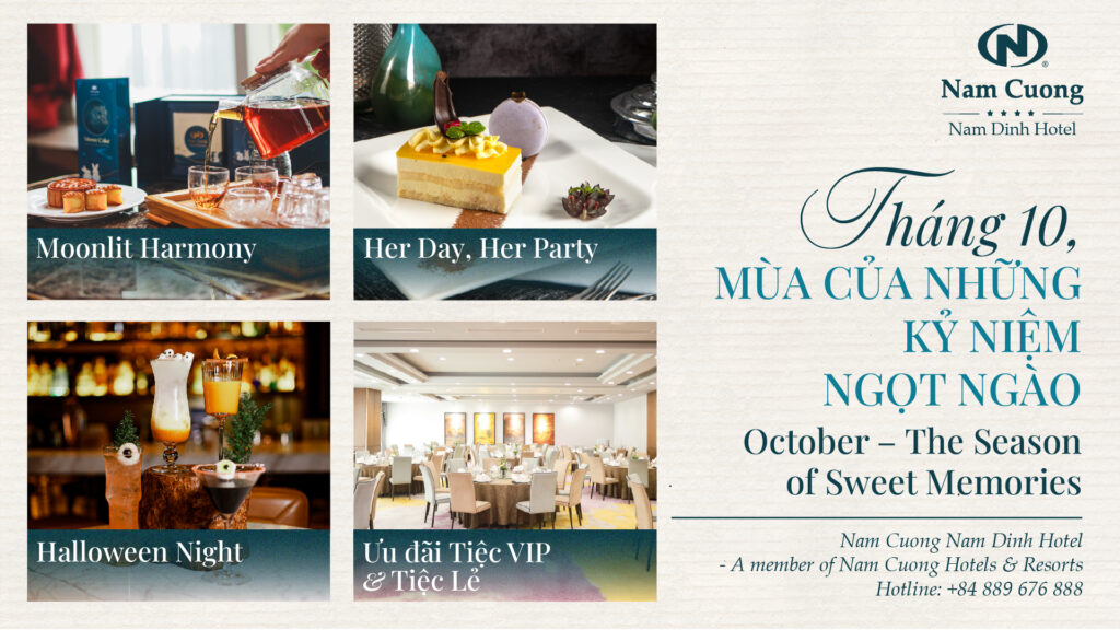 Tháng 10 về, mang theo không khí se lạnh của mùa thu và những khoảnh khắc đáng nhớ. Tại Nam Cường Nam Định Hotel, chúng tôi đã chuẩn bị một loạt chương trình và ưu đãi đặc biệt, biến tháng 10 của bạn trở nên thật ý nghĩa và trọn vẹn. Hãy cùng khám phá những trải nghiệm đặc sắc đang chờ đón bạn.